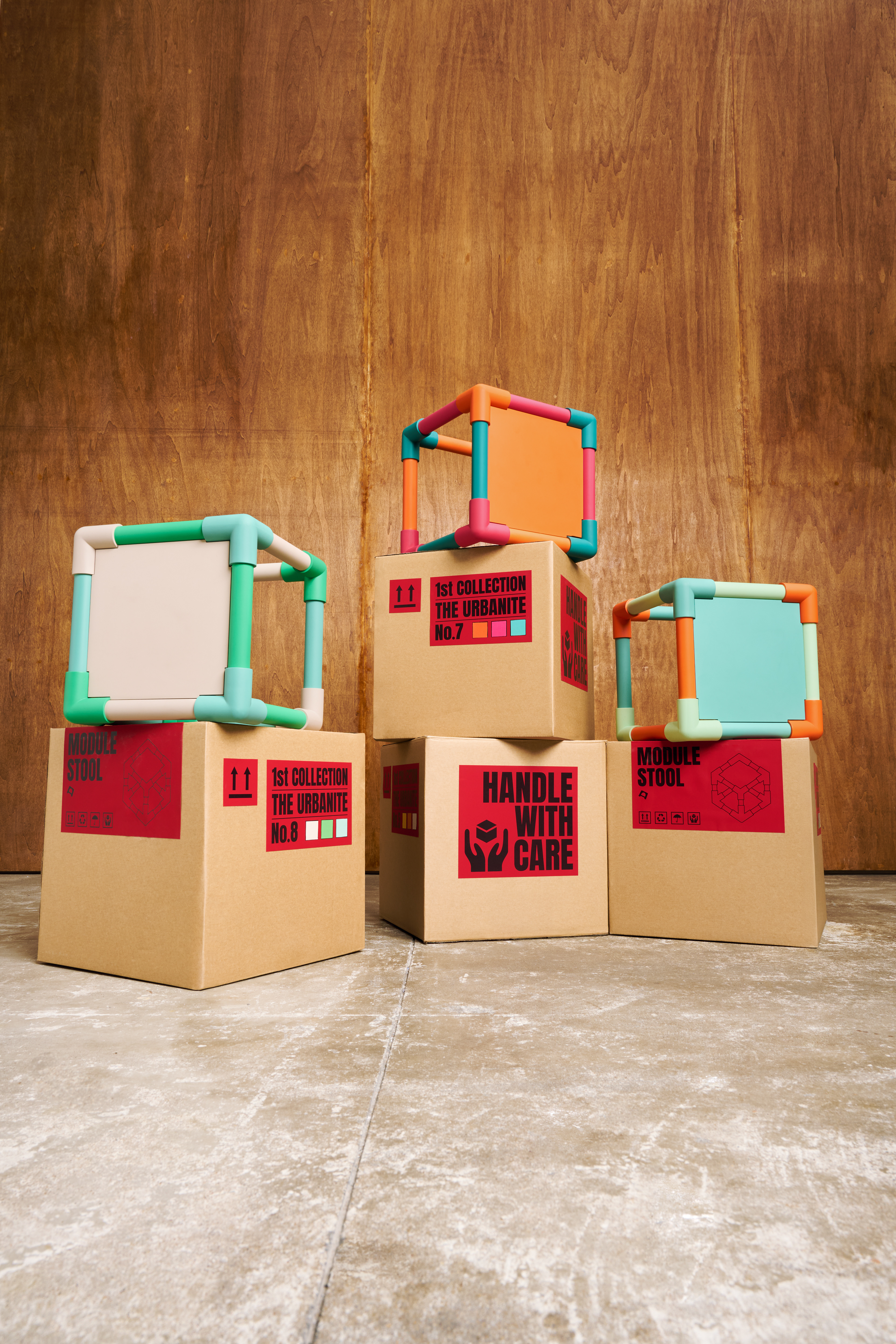 spontaneous night when my father turned discarded pieces into a cube-shaped frame. Its modular design allows each stool to carry its own color and character, becoming both playful and practical.